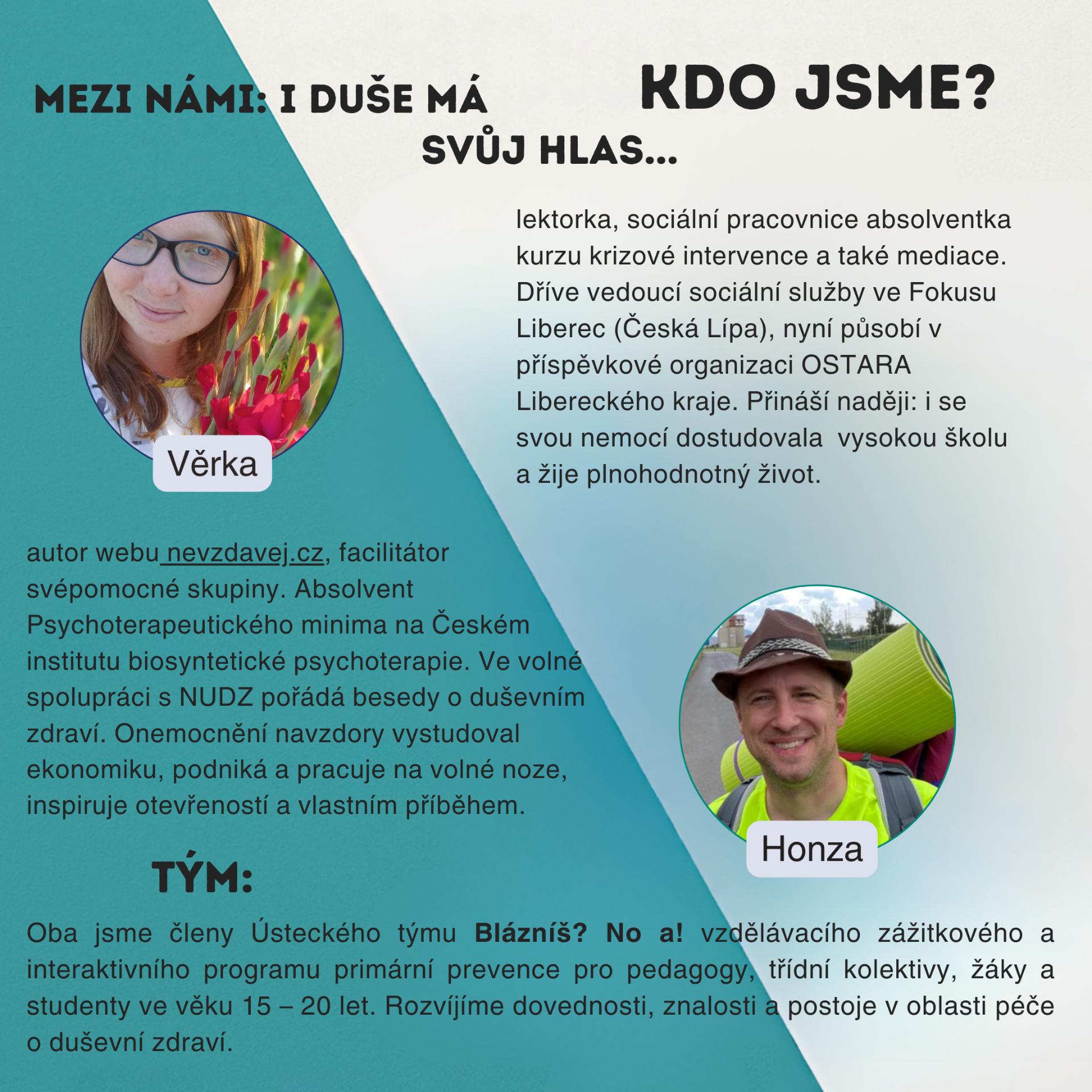 My (Věrka a Honza) a vy mluvíme o tom, jaké to je žít s duševním onemocněním – s depresí, mánií nebo úzkostmi. Sdílíme vlastní zkušenosti, pády i návraty, a hlavně to, že zotavení je možné.